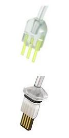 If the receiver tip looks like the second image then the receiver wire will either be SDS 4, SDS5 or SDS 6 wires. Where you connect the wire to your hearing aid SDS 4 and SDS 5 have 3 gold pins connecting into the body of the hearing aid (third image) whereas SDS 6 has a flat contact plate with 8 contact strips as per the fourth image.