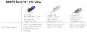 Surefit 2 receiver wires have a metal housing and Surefit 3 wires have a plastic housing and either blue or red colour markings. On the housing of the speaker wire you will see a number which is the size of the wire and letters denoting the power level (LP, MP or HP – Low, Medium and High).